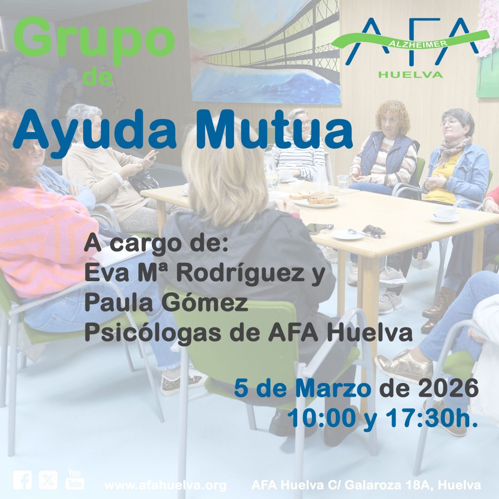 Grupo de ayuda Mutua, a cargo de Eva Mª Rodríguez, Psicóloga de AFA Huelva, a las 10:00h. y Paula Gómez, Psicóloga de AFA Huelva, a las 17:30h.